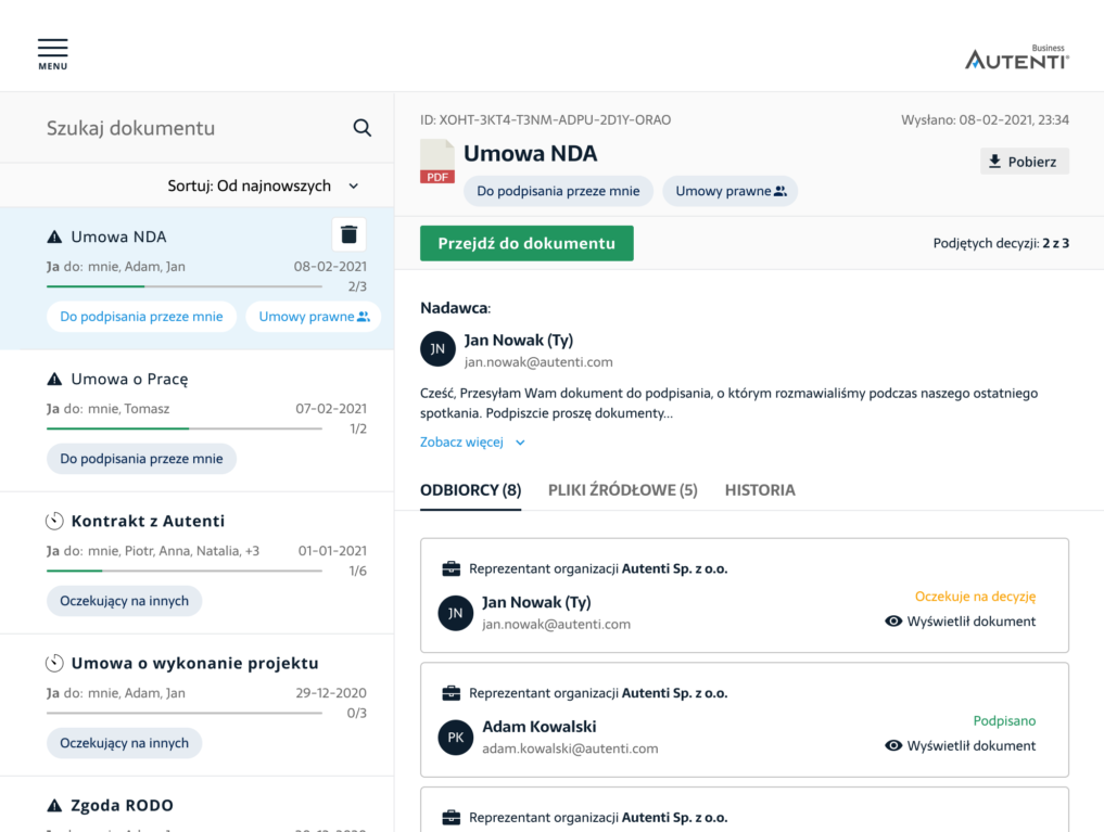 Jeśi mierzysz się w swojej firmie z papierologią, a szafy uginają się pod ciężarem segregatorów z dokumentami... Czas przejść na nowoczesne rozwiązanie i być paperless! Autenti to polska platforma pozwalająca na składanie oświadczeń woli w formie cyfrowej. W ten sposób możesz podpisać nawet 90% umów i dokumentów - jednym kliknięciem, na jednej platformie.