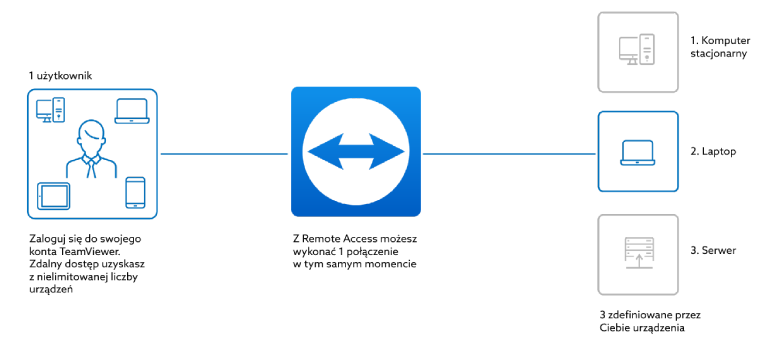 Komputer? Smartfon? Tablet? Nieważne z jakiego urządzenia chcesz wykonać połączenie. Licencja Remote Access umożliwia wykonanie połączenie z nielimitowanej liczby urządzeń do 3 urządzeń zdefiniowanych przez Ciebie. Możesz łączyć się z:
